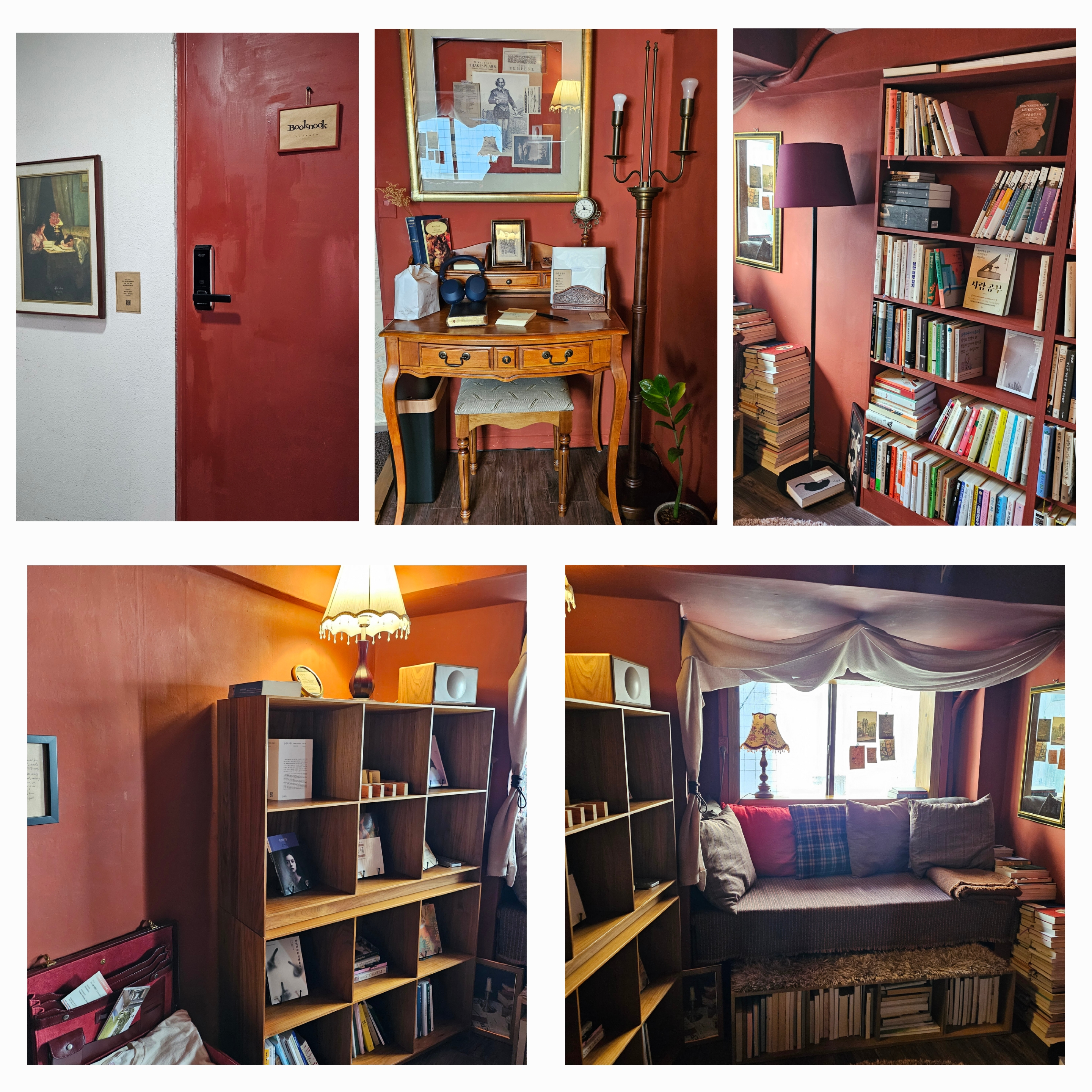 여기 제가 한번 가봤는데 혼자 책 읽고 싶을 때 가면 좋을 것 같은 곳이에요. 딱 혼자서 읽기 좋은 공간이면서 프라이버시도 지켜주는(?) 그런 곳입니다. 먼저 원하는 날 원하는 시간에 예약을 해주시면 사장님께서 예약한 당일 30분 전에 비밀번호를 알려주십니다. 그러면 그 비밀번호를 누르고 들어가셔서 편하게 원하는 책을 골라서 읽어도 되고 읽을 책을 챙겨 가셔도 좋습니다. 너무 아늑하고 따뜻한 곳이라 너무 좋아서 또 가고 싶은 곳입니다.